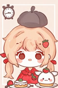 , 1girl, klee \(genshin impact\), food, hat, red headwear, gloves, clock, cake, pointy ears, chair, strawberry, cabbie hat, teacup, bangs, fruit, long sleeves, ahoge, brown gloves, cup, twintails, arm up, holding, clover print, solo, plate, hat feather, low twintails, hair between eyes, sitting, fork, long hair, open mouth, wall clock, table, light brown hair, indoors, sidelocks, dodoco \(genshin impact\), spoon, looking at viewer, bag, red coat, cake slice, orange eyes, coat, blonde hair, brown scarf, hat ornament, saucer, holding fork, red eyes, tea, scarf, feathers, strawberry shortcake, red dress, backpack, :o, teapot, window, blush