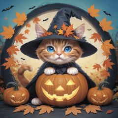 halloween style, hat, no humans, cat, jack-o'-lantern, pumpkin, leaf, witch hat, autumn leaves, blue eyes, solo, capelet, looking at viewer, sitting