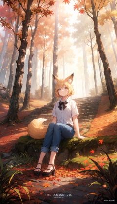 1girl, solo, looking at viewer, sitting, fox ears, full body, strappy heels,plaid shirt, short sleeves, (jeans), bow, bangs, low ponytail, blonde hair fox tail, fox girl, kitsune, ((autumn, outdoors, day, forest, falling leaves, bird, leaf)), (fog, dyntall effect), (wide shot, panorama, full body, depth of field),(movie poster,english text),(Flagstone road,branches)