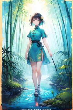 ((Ancient_Chinese_architecture)), (short sleeves), ((lotus,river,aqua_china_dress)),((spotted light,bamboos)),(black hair, short hair),(green eyes),(movie poster),(dew on leaves),(full body,wide shot,depth of field,panorama,mid shot)