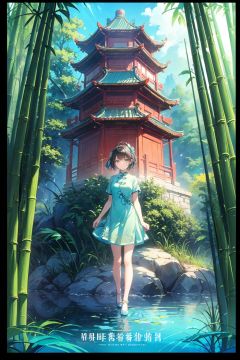 (( Chinese style architecture)), (short sleeves), ((lotus,river,aqua_china_dress)),((spotted light,bamboos)),(black hair, short hair),(green eyes),(movie poster),(dew on leaves),(full body,wide shot,depth of field,panorama,mid shot)