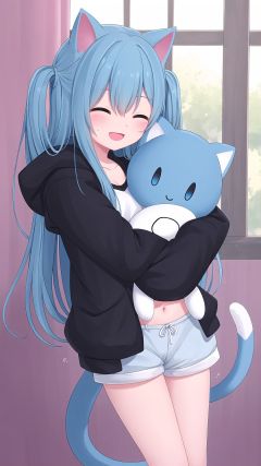 hood down, black jacket, 1girl, animal ears, sleeves past wrists, jacket, hooded jacket, blue hair, cat ears, hood, cat girl, white camisole, stuffed cat, closed mouth, tail, multiple views, camisole, cat tail, striped shorts, barefoot, flying sweatdrops, ^_^, short shorts, blue eyes, long hair, stuffed toy, shorts, long sleeves, closed eyes, blush, bangs, stuffed animal, flower, very long hair, holding flower, one side up, holding, holding stuffed toy, hair between eyes, navel, smile, open jacket, open clothes, striped, :d, white flower, collarbone, puffy sleeves, puffy long sleeves, object hug, open mouth, bare legs, standing