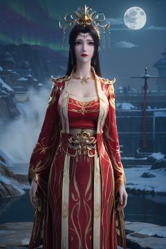 masterpiece, best quality, silk stockings, huge breasts, narrow waist, delicate face, put on makeup, (clouds, starry sky, aurora, moon:1.3), white skin, (sapphire like eyes:1.2), sapphire, (wild, water, forest), gold, diamond, waterfall landscape background, (red tang dynasty clothing, red wedding dress, gold jewelry), high heels, <lora:《斗破苍穹》云韵(婚衣)_v1.0:0.75>,