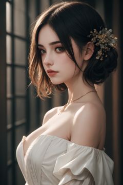 masterpiece, 8K, photographic of a girl, close up, ethereal beauty, elegant off-shoulder dress, mysterious ambiance, obscured silhouette, dimly lit, alluring look, chic bob hairstyle, FilmGirl, enchanted realm, cinematic lighting