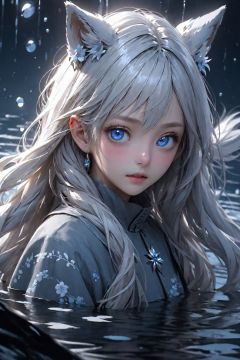 masterpiece, best quality,official art, extremelydetailed cg 8k wallpaper,(flying petals)(detailed ice) , crystalstexture skin, coldexpression, ((fox ears)),white hair, longhair, messy hair, blue eye,looking at viewer,extremely delicate andbeautiful, water, ((beautydetailed eye)), highlydetailed, cinematiclighting, ((beautiful face),fine water surface, (originalfigure painting), ultra-detailed, incrediblydetailed, (an extremelydelicate and beautiful),beautiful detailed eyes,(best quality),