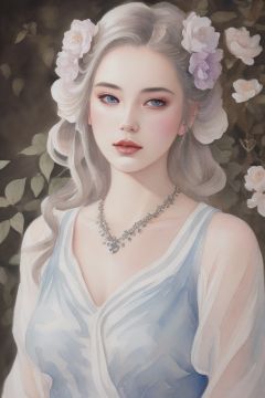 (((watercolo styly of a woman))), lying, be enchanted, (detailed painting inspired by Charlie Bowater:1.3), blooming exquisite necklace, detailed fantasy, white silver painting, her face is a lilac flower, dreamland,fine art parody,claborate-style painting