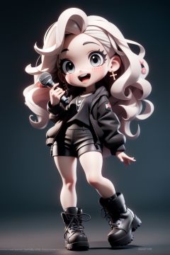 masterpiece,best quality,8K,pencil skirt,official art,ultra high res,1girl,solo,long hair,holding microphone,microphone,boots,jewelry,earrings,open mouth,shorts,black footwear,looking at viewer,holding,full body,smile,white hair,jacket,blush,black shorts,long sleeves,pigeon-toed,grey eyes,black jacket,hood,teeth,cross-laced footwear,wavy hair,shirt,:d,female child,tattoo,curly hair,short shorts,