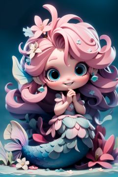 masterpiece,best quality,8K,official art,ultra high res,1girl,mermaid,solo,pink hair,flower,blue eyes,hair ornament,shell,hair flower,smile,freckles,looking at viewer,own hands together,long hair,<lora:3D-chibi:1>,
