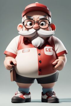 masterpiece, best quality, 8K, collared shirt, official art, ultra high res, 1boy, old man, fat man, food, mustache, v-shaped eyebrows, male focus, thick eyebrows, solo, black-framed eyewear, hat, shoes, holding, shirt, standing, glasses, red headwear, facial hair, short sleeves, full body, looking at viewer, holding food, employee uniform, black eyes, red shirt, simple background, grey background, socks, uniform, shorts