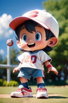 masterpiece,best quality,8K,official art,ultra high res,1boy,male focus,solo,shorts,hat,male child,blue eyes,shoes,socks,black hair,smile,open mouth,baseball cap,blush,sneakers,shirt,outdoors,full body,blurry background,child,