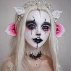 aw0k halloween makeup, (art by Eero Saarinen:0.7) , photograph, Divine Boorish ( a woman in makeup:1.2) , Producing a TV show, Fur-Trimmed hair styled as Crown braid, from inside of a Sad Bangkok, Snowy, tilt shift, Anime screencap, Evil, cyberdelic, film grain, Nikon Z9, macro lens, detailed eyes and pupils, <lora:halloweenmakeup-000007:0.8>
