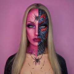 a woman in half face spiderman makeup, half face looking normal, cyberpunk, dark, dystopian, backlit, night time lights, highres, portrait, beautiful, neon cyberpunk suit, 8k, glowing tattoos, highly detailed,  <lora:halloweenmakeup-000007:0.8>