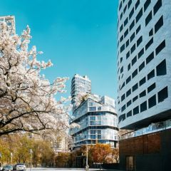 white_building,architecture, bare_tree, building, city, cityscape, day, gradient, gradient_background, house, outdoors, scenery, sky, skyline, skyscraper, street, tree ,best quality