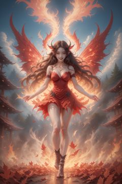 Hyperrealistic art, BJ_Sacred_beast, A girl is dancing, solo, long_hair, bare shoulders, red_dress, skirt, (((wings, red_wings))), (full shot), looking_at_viewer, , horns, fire, teeth, day, no_humans, smoke, Autumn, maple leaves, cinematic lighting, strong contrast, high level of detail, Best quality, masterpiece, Extremely high-resolution details, photographic, realism pushed to extreme, fine texture, incredibly lifelike, xxmix_girl, BJ_Blue_butterfly, halloween style, <lora:EMS-57022-EMS:0.700000>, , <lora:EMS-15505-EMS:0.700000>, , <lora:EMS-33527-EMS:0.800000>, , <lora:EMS-59373-EMS:0.800000>