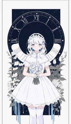 (white theme:1.7),((best quality)), ((masterpiece)), ((ultra-detailed)), (illustration), (detailed light), (an extremely delicate and beautiful),incredibly_absurdres,(glowing),(1girl:1.7),(cowboy shot:1.4),standding,(white hair),(beautiful blue eyes),((flower headdress)),(stockings),((english text)),(garden),((flower)),(clock<galaxy>),(border:1.5),