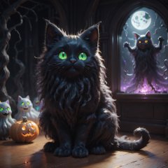 (Craft a lovable, mirthful witch's familiar in the form of a cute, miniature black cat with bright, magical eyes and a mischievous aura. This Halloween monster should charm with its supernatural companionship), 8k octane render, high detail, masterpiece, hyperdetailed, intricate details, 8K resolution, Cinema 4D, Behance HD, Unreal Engine 5, rendered in Blender, trending on Artstation, epic, cinematic background, dramatic, atmospheric, (masterpiece, best quality:1.2),greg rutkowski,6000,Landskaper,Furry,fluffy,Monster