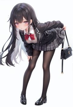 1girl, solo, pantyhose, skirt, long hair, loafers, shoes, simple background, school uniform, brown eyes, plaid, black pantyhose, plaid skirt, looking at viewer, black hair, pantyhose pull, full body, clothes pull, black footwear, pleated skirt, leaning forward, bangs, long sleeves, bent over, cardigan, bow, bowtie, standing, closed mouth, pulled by self, grey background, blush, miniskirt, red bow, sweater, **********