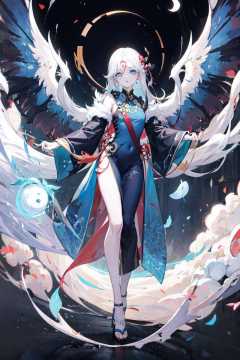 (Highest picture quality), (Master's work), (Detailed eye description), (8K wallpaper),(Detailed face description),colorful,looking at viewer,solo,(full body:1.1),(Jiangshi:1.4|((mecha body:1.1),detail mecha body,wet body,(mechanical wings),(giant wings:1.1),detail wings):0.5), expressionless, pale skin, blue eyes, forehead mark,ba gua, tai chi, yin yang, claws, death,[chinese clothes, china dress,[taoist robes, celestial being uniform]],