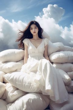 <lora:wlqc_20231013073450:0.85>A woman with long hair sitting on many pillows surrounded by clouds, brown eyes, Nana sauce style, ethereal beauty, sheet-like film, white, 32k uhd, fashionable photography, polished and deformed