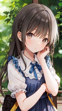 1girl, solo, long hair, dress, brown hair, short sleeves, brown eyes, looking at viewer, blue dress, blurry background, blurry, puffy short sleeves, bangs, puffy sleeves, closed mouth, hand up, depth of field, hand on own face, collared dress
