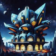 ((best quality)), ((masterpiece)), (hyper detailed), Spacepunk architecture Supernova Mixed-use Building, <lora:DonMF41ryW1ng5XL:1>