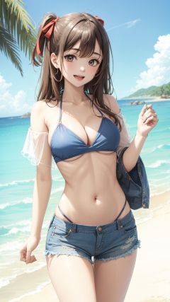 1girl, solo, outdoors, swimsuit, bikini, shorts, breasts, blue shorts, navel, long hair, wet, stomach, looking at viewer, bare shoulders, smile, brown eyes, thighs, brown hair, blue bikini, off shoulder, beach, innertube, short shorts, cowboy shot, cleavage, open mouth, medium breasts, hair ribbon, day, denim shorts, :d, see-through, holding, denim, midriff, one side up, bikini top only, standing, collarbone, ribbon, crop top, bikini under clothes, off-shoulder bikini