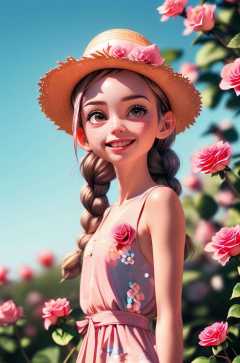 <lora:caomao:0.8>1girl, solo, hat, braid, twin braids, flower, blurry, blurry background, straw hat, black hair, outdoors, long hair, looking at viewer, upper body, smile, day, depth of field, pink flower, hair over shoulder, bare shoulders, freckles, sky