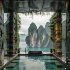 <lora:greenroom-HXZ:0.8>green house,tree,mountain,bathtub,pool