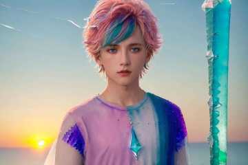 <lora:handsome:0.7> solo, blue eyes, short hair, looking at viewer, upper body, (1boy:1.1), pink hair,cup, sunset,multicolored hair, blue hair,(((crystals texture Hair))),((beautiful detailed glass hair)),((glass shaped texture hand)),((crystallize texture body)),gem body,hands as clear as jewels,crystallization of clothes,((crystals texture skin)),sparkle, lens flare, light leaks,broken glass,detailed glass shaped clothes,beautiful detailed gemstone sky, gemstone sea, crystals texture flowers,((detailed crystallized clothing)),