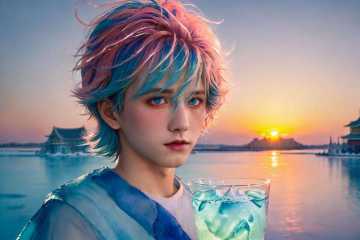 <lora:handsome:0.7> solo, blue eyes, short hair, looking at viewer, upper body, 1boy, pink hair,cup, sunset, beautiful detailed glow,detailed ice,beautiful detailed water,(floating palaces:1.2),multicolored hair, blue hair,beautiful detailed glow, (detailed ice), beautiful detailed water,