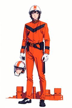 (masterpiece:1.3), (the best quality:1.2), (super fine illustrations:1.2), (Masterpiece), high quality, high detail,((white background:1.2)), looking at viewer, (SOLO:1.4),outline,,simple background, mat_style,orange_bodysuit,military_uniform,((helmet)),belt,mat_style,white_gloves,uniform