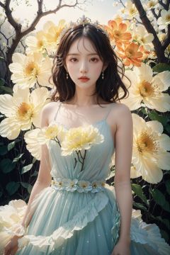 masterpiece, princess, Crown, Huge flowers, Flower, Flowers, Flowers, Flowers, anatomically correct, high details, best quality, HD, 16k,Only flowers,It's all flowers, sparkling dress,Dry branches, Flowers