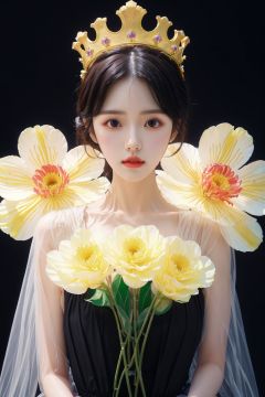 masterpiece, princess, Crown, Huge flowers, Flower, Flowers, Flowers, Flowers, Black dress, Medium chest, Lovely, Big eyes, anatomically correct, high details, best quality, HD, 16k