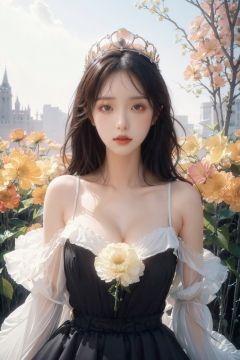 masterpiece, princess, Crown, Huge flowers, Flower, Flowers, Flowers, Flowers, Black dress, Medium chest, Lovely, Big eyes, anatomically correct, high details, best quality, HD, 16k