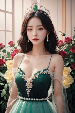 masterpiece, Roses, Roses, Gem, Luminescence, Pearl, Agate, Emerald, Jade stone, princess, Crown, Huge flowers, Flower, Flowers, Flowers, Flowers, Black dress, Medium chest, Lovely, Big eyes, anatomically correct, high details, best quality, HD, 16k