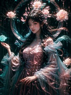 masterpiece,best quality,8k,insane details,intricate details,hyper quality,high detail,ultra detailed,realistic,1girl,long hair,jewelry,looking at viewer,dress,hair ornament,black dress,bracelet,bare shoulders,full body,tail,pink flower,black hair,solo,looking at viewer,earrings,black background,lips,wavy hair,glowing,detached sleeves,closed mouth,beads,makeup,long sleeves,EpicSky, huansha,neon_dress, cute girl,colorful,
