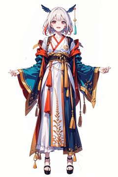 (masterpiece:1.3), (the best quality:1.2), (super fine illustrations:1.2), (Masterpiece), high quality, high detail,((white background:1.2)), looking at viewer, (SOLO:1.4),outline,,simple background, feather_hair_ornament, open_mouth, pink_hair, red streaked hair, hair_ornament, red_eyes, centre parting bangs, feathers, feathered_wings, smile, white_hair, gradient hair, yu fuhua