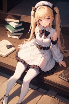 best quality,(masterpiece:1.3),fullbody,ultra-detailed,solo:1.3,1GIRL,smiling,1girl,hat,latin cross,blonde hair, long hair,twintails,twin drills, blue eyes,bow,white dress,frilled skirt,detached sleeves,white pantyhose,book,belt, <lora:barbara:0.0>
