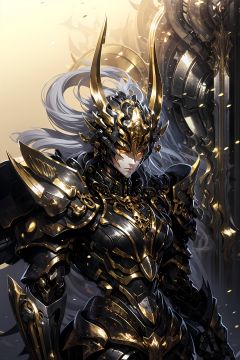 HeiJing1, solo, armor, horns, helmet, long hair, 1girl, full armor, closed mouth, fake horns, shoulder armor, black hair, upper body
