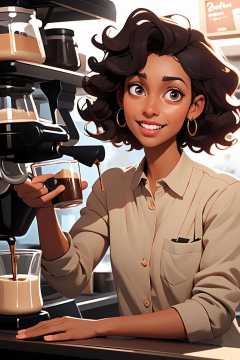 (best quality, masterpiece), black girl, happy, coffee, curly hair, barista,