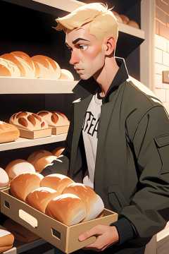 (best quality, masterpiece), 1boy, blonde, jacket, buying bread,
