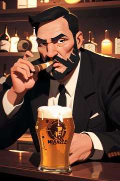 (best quality, masterpiece), beared man, holding cigar, bar, beer,