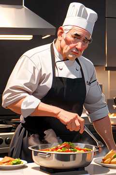 (best quality, masterpiece), old man, fat, chef, cooking, sweat
