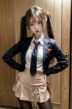 futuaner, 1girl, solo, skirt, pantyhose, shirt, twintails, jewelry, earrings, white shirt, heart earrings, brown hair, black skirt, heart, hand on hip, black eyes, looking at viewer, necktie