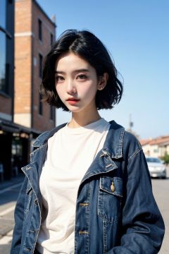 1girl, solo, blurry background, black hair, outdoors, light on face, blurry, black eyes, upper body, lips, day, sky, realistic, blue sky, shirt, white shirt, short hair, jacket, closed mouth, looking to the side,