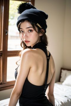 xxmixgirl,Thorough, analog style, eye focus, highest quality, (highly detailed skin), photo of a exquisitely beautiful pale skin punk Dutch girl, 21yo, (wearing harness, and beanie), perfect face, alluring eyes, [seductive makeup], skin pores, (piercing:0.5), indoor, messy bedroom, (bokeh:0.6), sharp focus, dappled lighting, (backlighting:0.7), film grain, photographed on a Sony A7R IV, 18mm F/1.7 cine lens, (highly detailed, intricately detailed), 8k, HDR, seductively posing, front view, (uppper body:0.9)