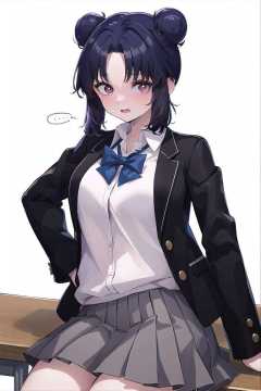 origin, (white background), 1girl, solo, blush,embarrassed,sitting,school uniform,sitting,pleated skirt, hand on hip,cowboy shot,, <lora:kuromiya-000008:0.9>