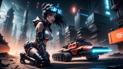 morisv, 1girl, breasts, solo, blue eyes, cyberpunk, night, black hair, headgear,Riding a robot,building, looking at viewer, science fiction, dutch angle, navel, goggles on head, city, gloves,  elbow gloves, sky, mechanical legs