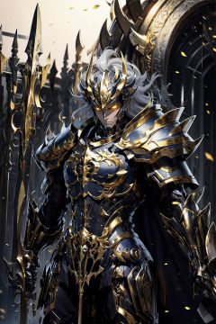 HeiJing1, weapon, armor, solo, holding weapon, helmet, holding, polearm, 1boy, male focus, long hair, full armor, gauntlets, shoulder armor, cape, pauldrons, holding polearm, standing, gold armor, breastplate, closed mouth, spear