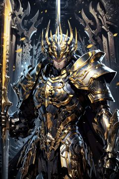 HeiJing1, weapon, armor, full armor, holding, sword, holding weapon, solo, helmet, holding sword, gauntlets, shoulder armor, pauldrons, 1boy, gold armor, standing, breastplate, male focus, cape, dual wielding, knight